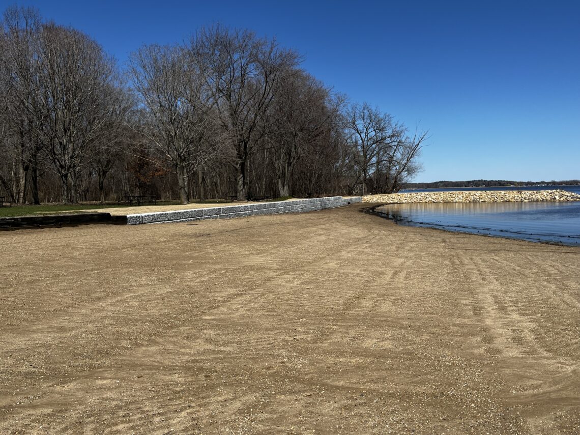 Shoreline reparations are nearly complete at the dog and swimming beach areas. The breakwater retaining wall near the beach looks terrific!
